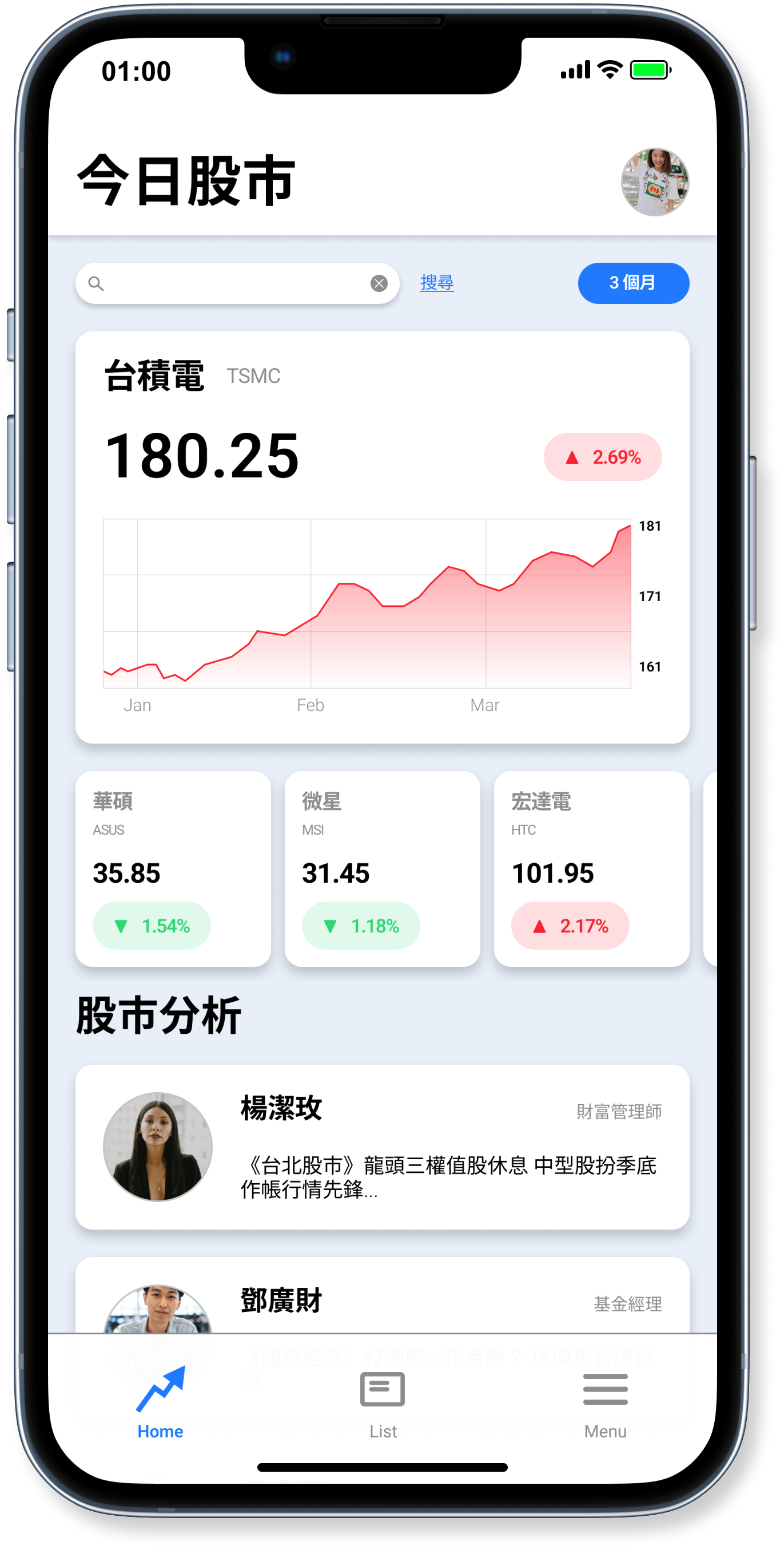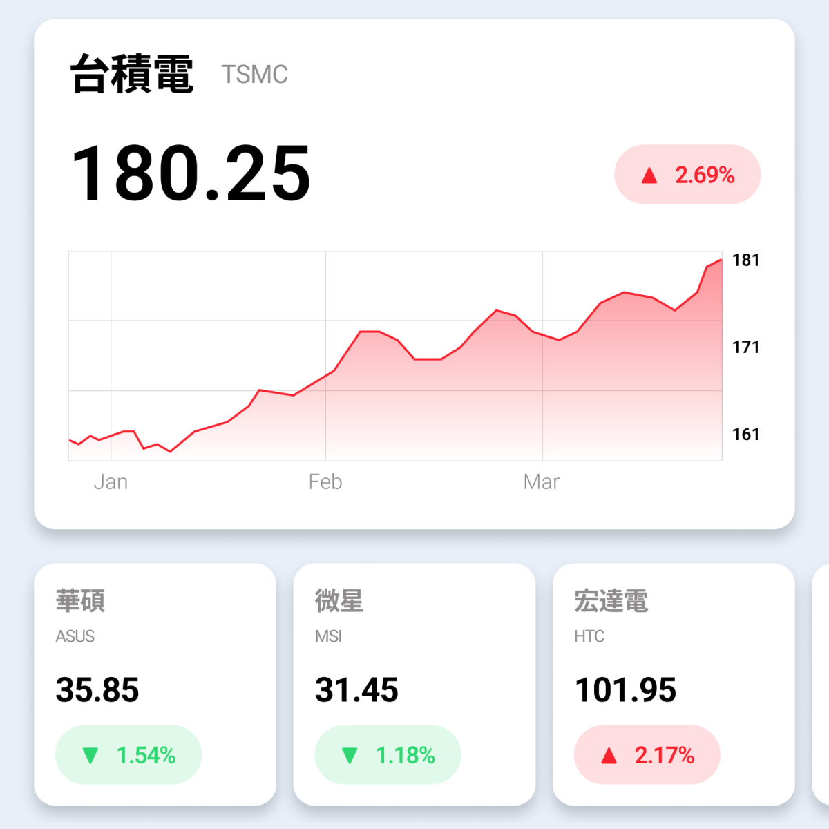 The stock market analysis product is designed for a Taiwan-based investment company, allowing users to view real-time market trends and customize their watchlists for both stocks and analysts. The product prioritizes data visualization to enhance users' understanding of complex financial data and analysis. It's worth noting that the Taiwan stock market convention uses red to indicate an increase in value and green to indicate a decrease, which differs from the convention used in the US market. This is a deliberate design choice of localization.
