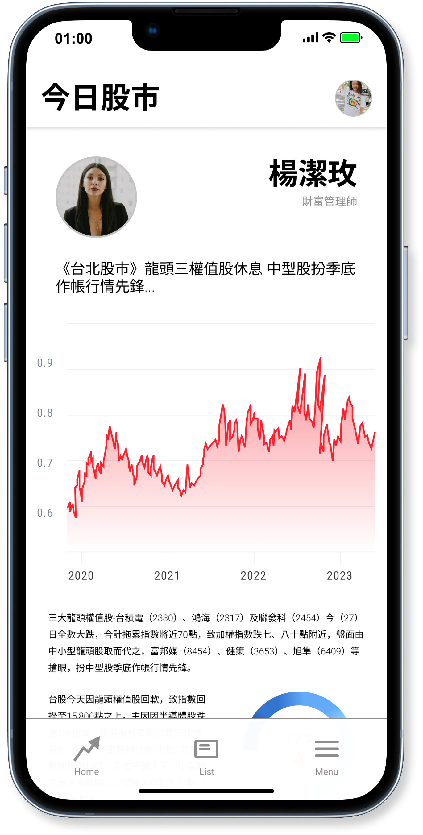 The centerpiece of the product's homepage is a clear and easy-to-understand stock market graph, which enables users to quickly understand the rise and fall of the stocks. Below the large chart, there is a horizontal row of customizable small charts that allow users to track their preferred stocks. Each small chart displays the current price of the stock and the percentage change in color. This intuitive layout provides users with a clear understanding of the stock market at a glance, even without a line chart.