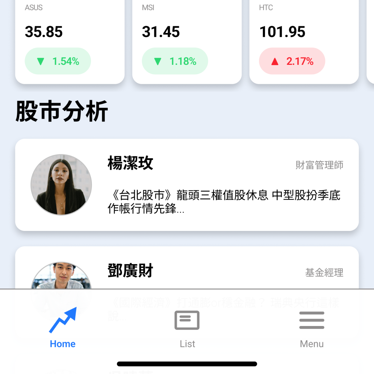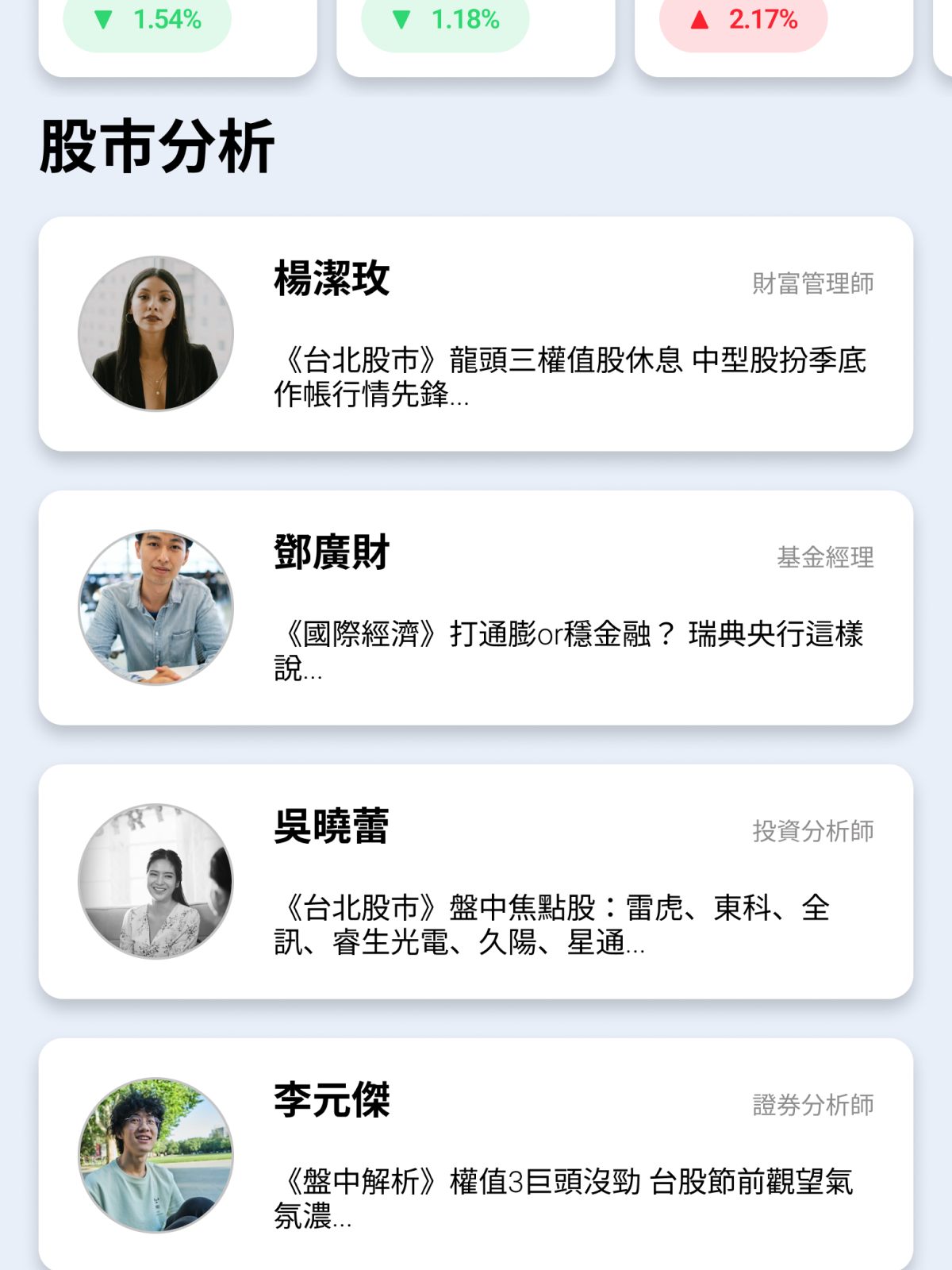 The homepage also features a list of analysts in the middle section, which allows users to easily follow their preferred analysts and read their real-time stock analysis. Before entering the desired analyst's page, users can see the propositions or main titles analyzed by each analyst on that day. This design not only provides users with the latest insights from industry experts but also allows them to customize their information sources according to their preferences. By providing an intuitive layout and clear visual hierarchy, users can quickly locate and access the information they need.